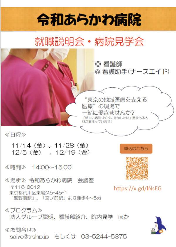 【令和あらかわ病院】看護師・ナースエイド向け就職説明会・病院見学会を開催! お気軽にご参加ください。≪11月‐12月≫